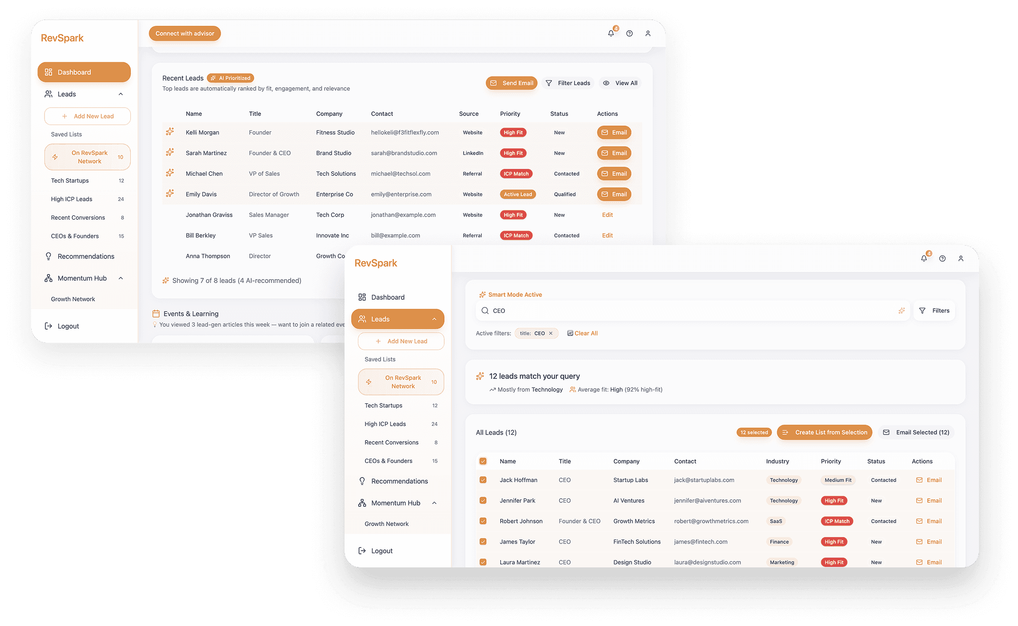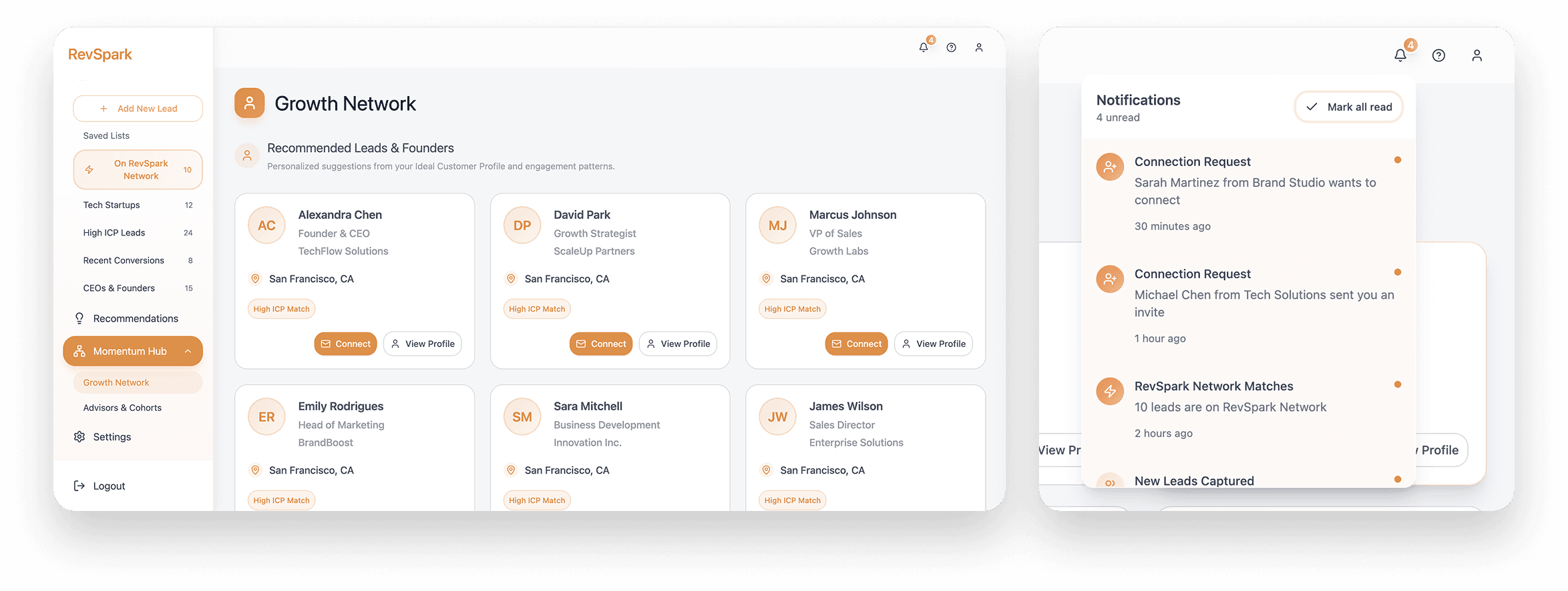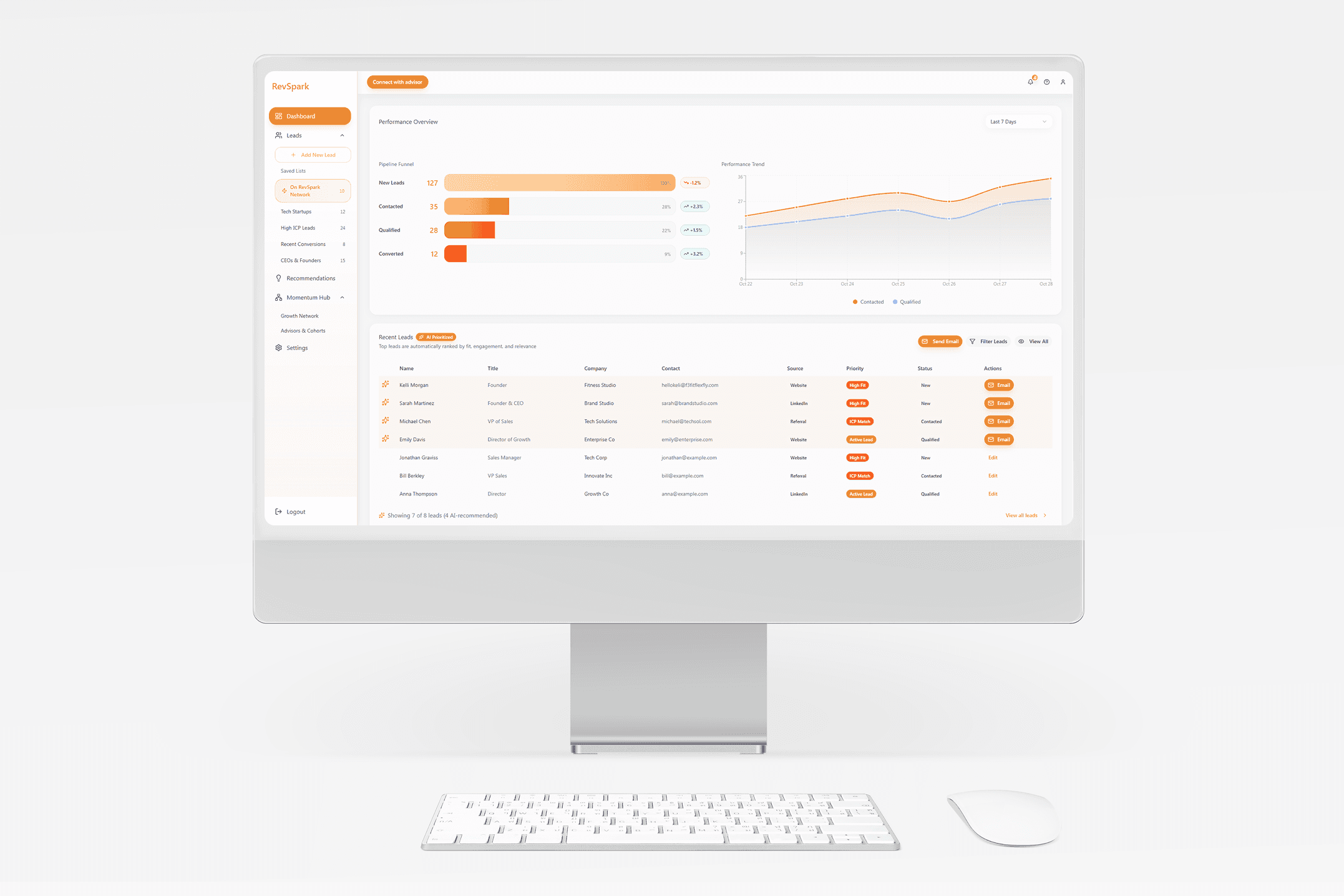 RevSpark is a guided sales platform that brings together automation, intelligence, and human support. The system is designed to turn daily sales chaos into clarity by helping founders focus on the right leads and take the right actions.