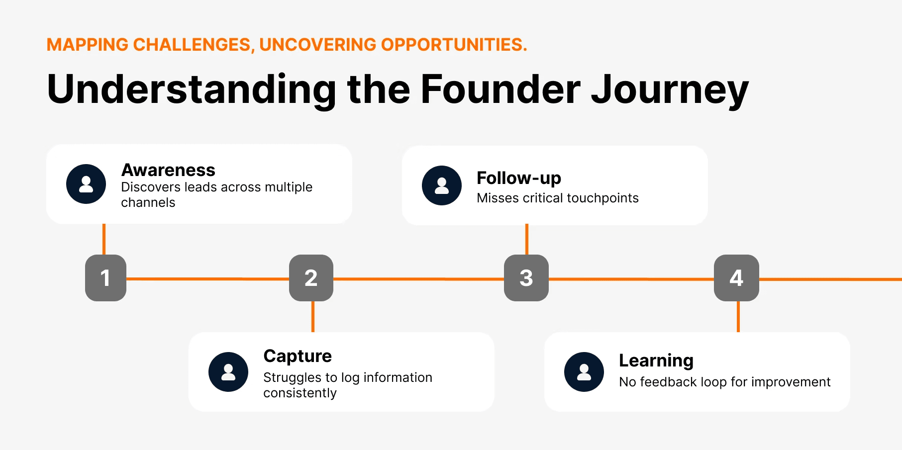 User research focused on understanding the day-to-day experience of SMB founders and sales leaders. Through interviews and scenario-based exploration, I studied how founders currently discover, track, and follow up on leads.