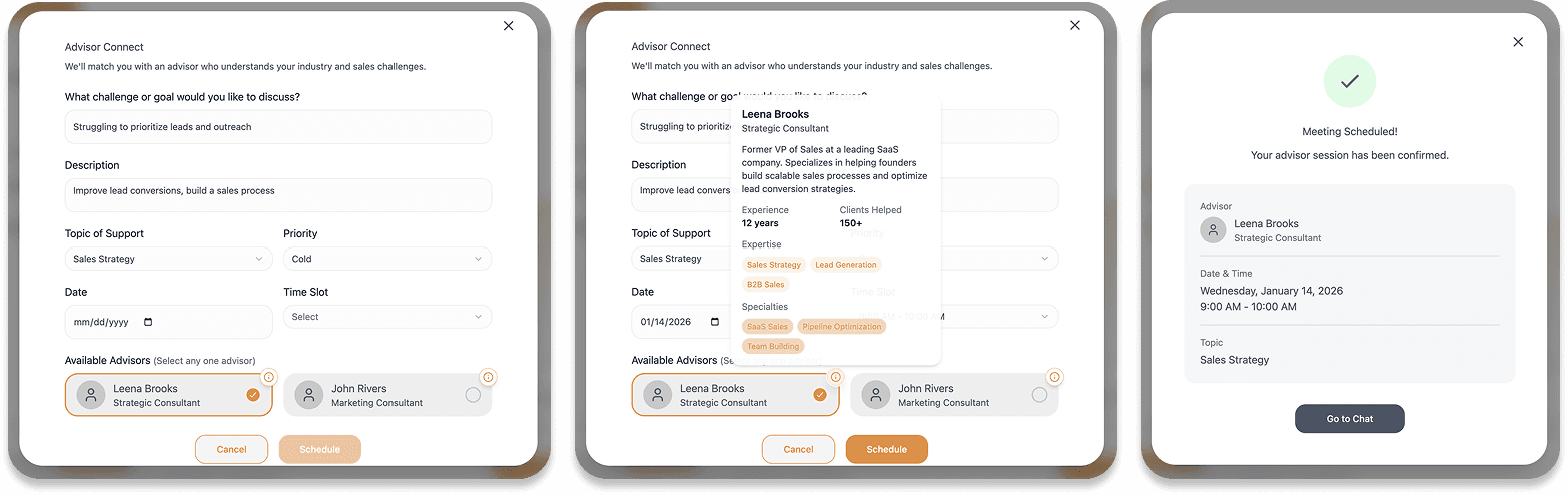 An in-app feature that allows founders to connect with experienced advisors through scheduling and chat. This adds a human layer to the sales process, providing mentorship and accountability.